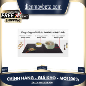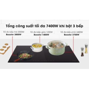 Tổng công suất 7400W khi mở cùng lúc 3 vùng nấu, mỗi vùng nấu đều có chức năng Booster gia nhiệt nhanh