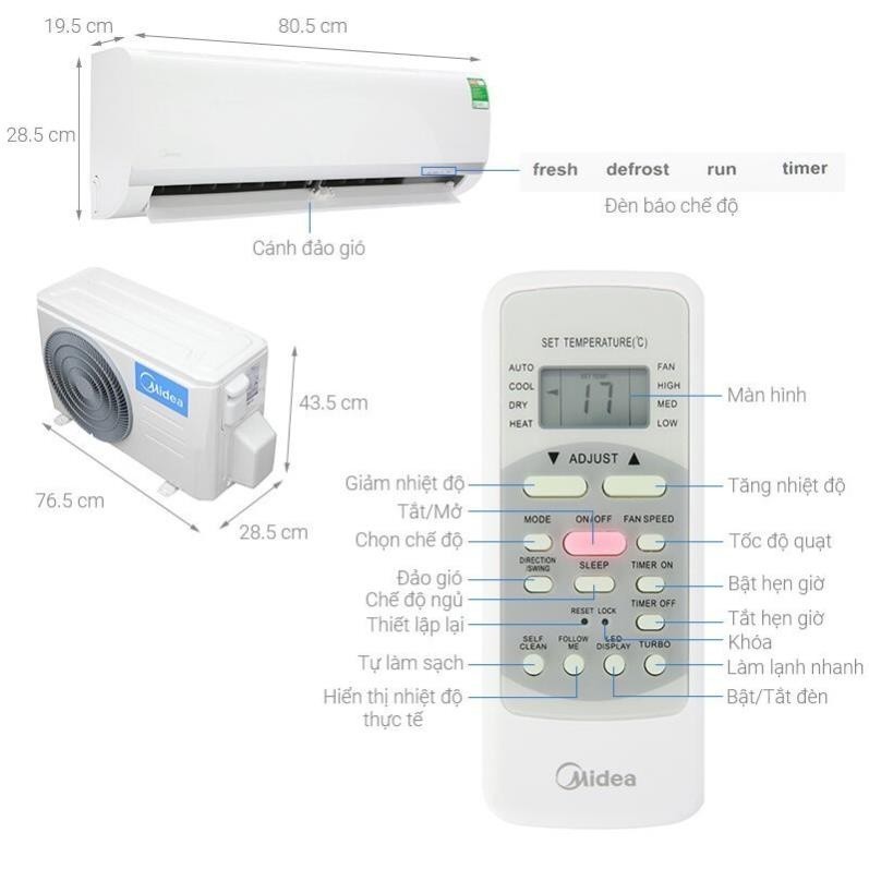 Thông tin cục nóng: Dài 76.5 cm – Cao 43.5 cm – Dày 28.5 cm – Nặng 24 kg