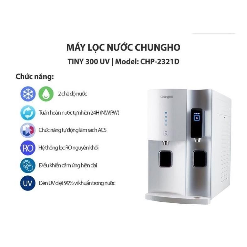 Máy lọc nước để bàn ChungHo Iguassu Tiny 300 CHP-2321D sản xuất tại Hàn QuốcChungho Iguassu Tiny 300 sử dụng màng RO số 1 của Mỹ (DOW) để loại bỏ tất cả các tạp chất như bùn đất, thuốc trừ sâu… các loại vi khuẩn có hại cho cơ thể, mang lại cho gia đình bạn nguồn nước sạch và an toàn. Nước sau lọc với máy lọc nước RO Chungho uống được trực tiếp mà không cần đun sôi. Máy thiết kế vòi nước lạnh và vòi nước thường riêng biệt. Kiểu dáng máy nhỏ gọn, đặt bàn sử dụng không chiếm nhiều diện tích. Máy lọc nước không chỉ có chức năng lọc nước mà còn tích hợp chế độ làm lạnh nước, đáp ứng được nhiều mục đích sử dụng của người dùng. Dung tích bình nước lạnh là 3 lít. Máy lọc nước Chungho có hệ thống lọc 4 cấp với bộ lọc nguyên khối: Cấp lọc 1 + 2 (T-RRE CARBON): Sẽ loại bỏ gỉ sét, clo, bùn đất, tạp chất khác.