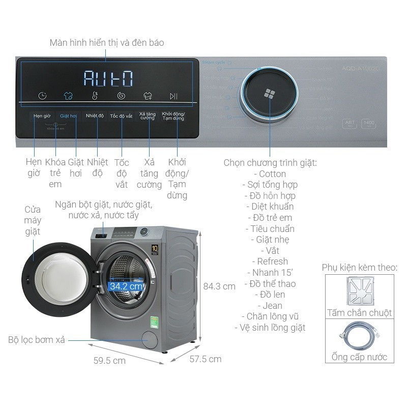 Máy giặt Aqua Inverter 10 kg AQD-A1002G S là kiểu máy giặt cửa trước hiện đại với công nghệ làm mới quần áo bằng hơi nước Refresh giảm nhăn, cùng kích thước lồng giặt lớn 525 mm giảm xoắn rối quần áo trong quá trình giặt, tiết kiệm thời gian là ủi. Bên cạnh đó, công nghệ giặt cân bằng AI DBT cho hiệu suất quay vắt ổn định, hạn chế rung lắc, máy vận hành êm. Tổng quan thiết kế