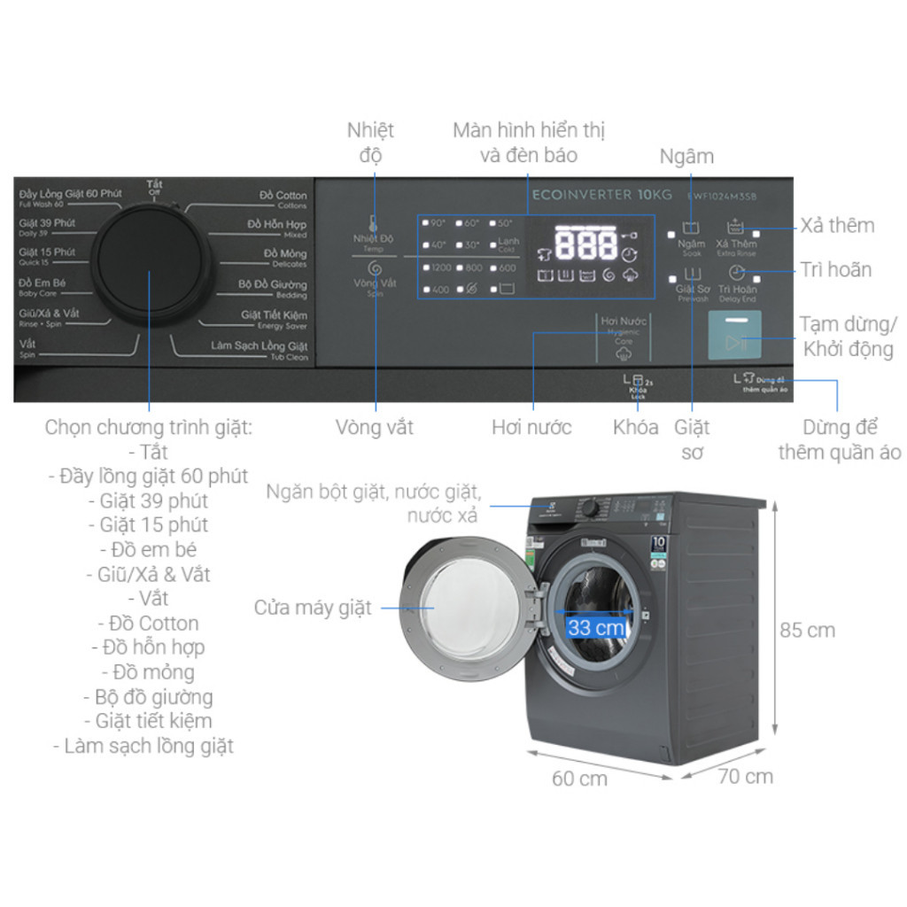 THÔNG SỐ KỸ THUẬT MÁY GIẶT ELECTROLUX EWF1024M3SB:Loại máy giặt: Cửa trước, lồng ngang.