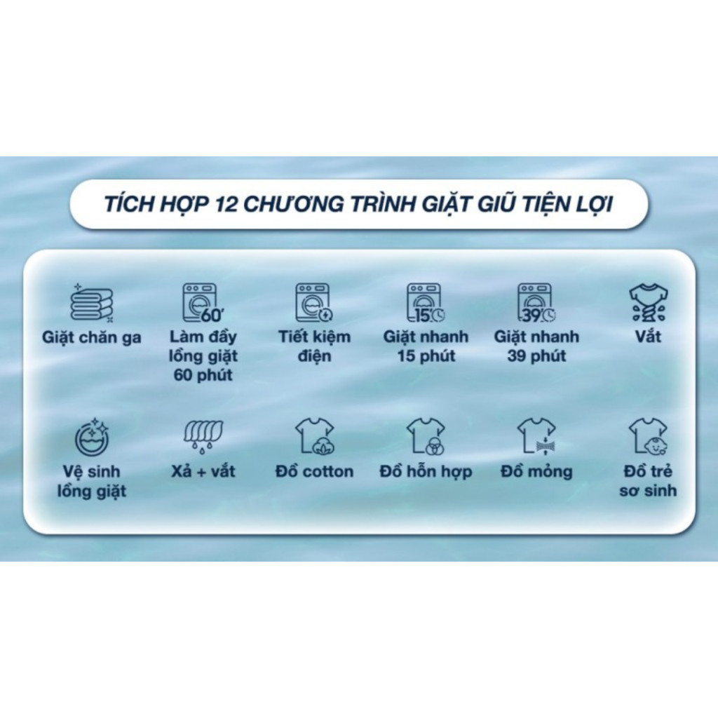 Chương trình giặt đa dạng: Giặt chăn ga, làm đầy lồng giặt 60 phút, tiết kiệm điện, giặt nhanh 15 phút, giặt nhanh 39 phút, vắt, vệ sinh lồng giặt, xả + vắt, đồ cotton, đồ hỗn hợp, đồ mỏng, đồ trẻ sơ sinh.