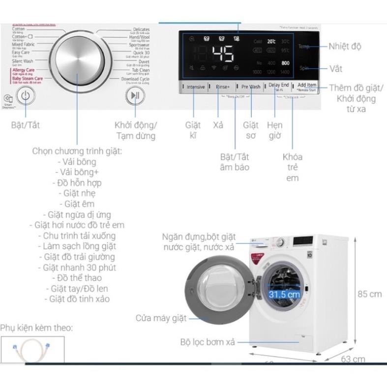 Thông số kỹ thuật Máy giặt LG Inverter 8.5 kg FV1408S4WMáy giặt LG Inverter 8.5 kg FV1408S4W