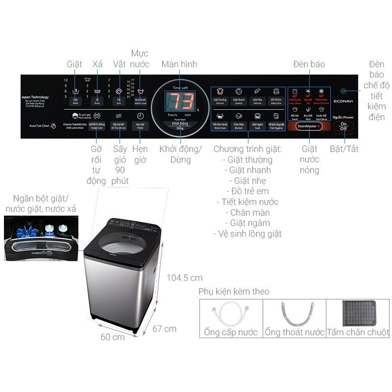 Chương trình giặtBình thường, Nhanh, Đồ sơ sinh, Đồ mỏng, Tiết kiệm nước, Chăn, Vệ sinh lồng giặt, Ngâm, Sấy gió (90 phút), Gỡ rối tự động