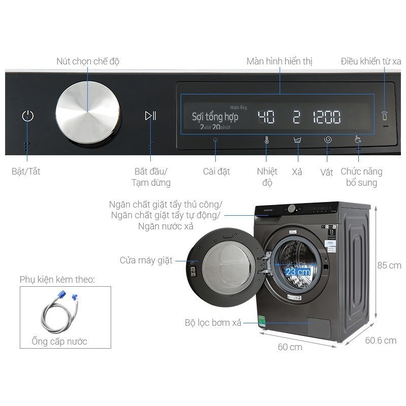 Tiện ích: Cho phép điều khiển từ xa qua ứng dụng SmartThingsChống nhănGiặt Sạch, Nhanh Chỉ 59 PhútKhóa trẻ emTự động vệ sinh lồng giặt
