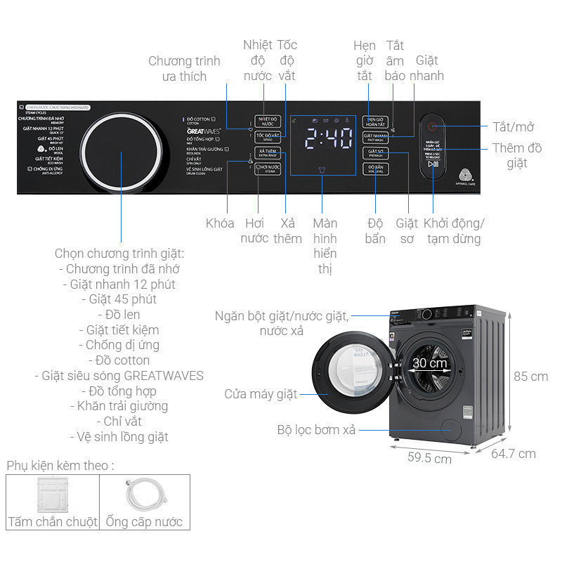 Tiện ích:Hẹn giờ giặtKhóa trẻ emThêm đồ trong khi giặtTự khởi động lại khi có điệnVệ sinh lồng giặtĐèn chiếu sáng lồng giặtChế độ giặt sơ tự độngThông tin lắp đặtKích thước, khối lượng:Cao 85 cm – Ngang 59.5 cm – Sâu 64.7 cm – Nặng 72 kg