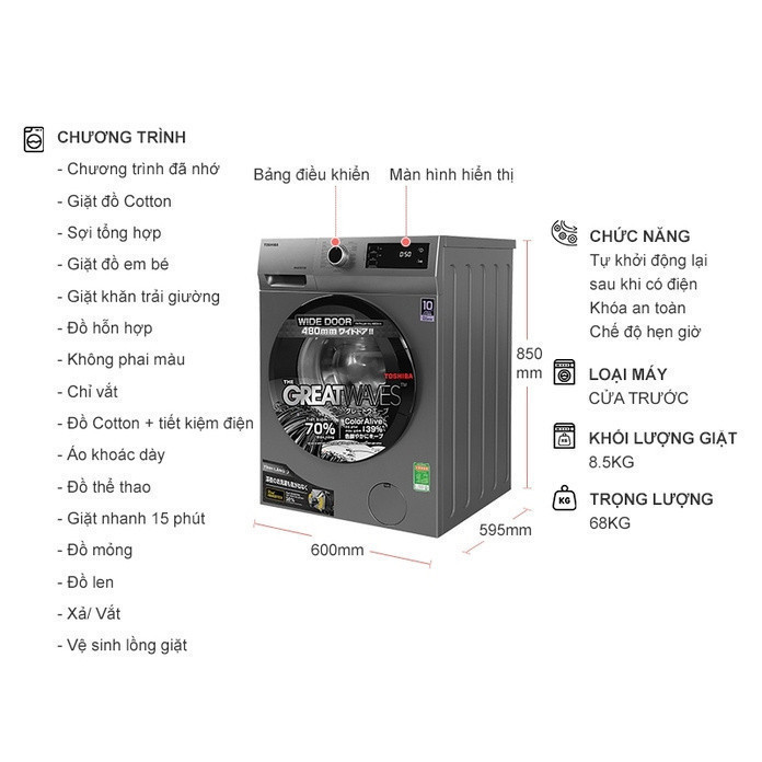 Review Máy giặt Toshiba Inverter 8.5 kg TW-BK95S3V(SK) DMK