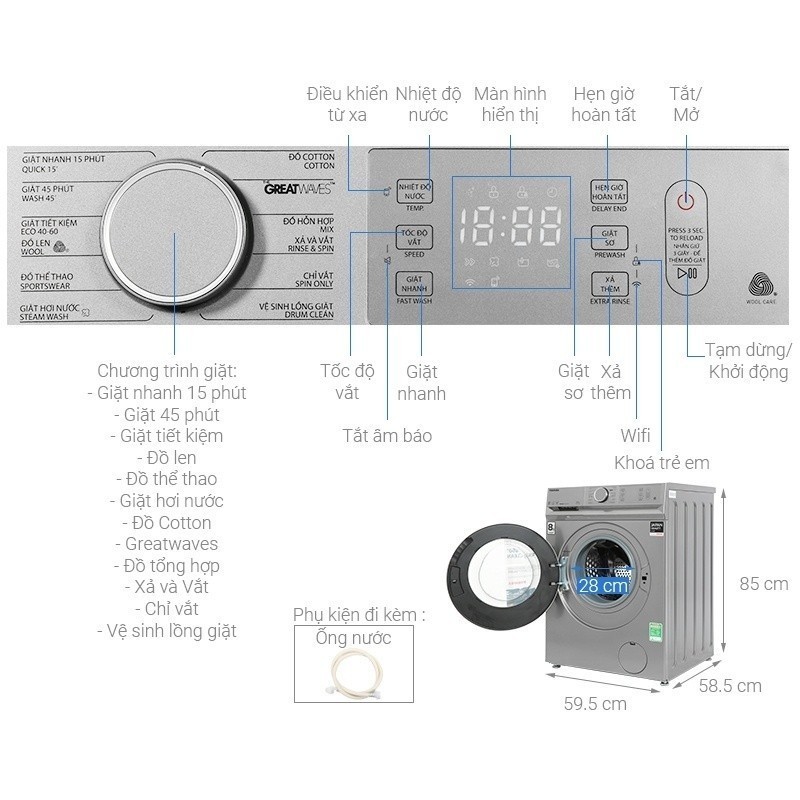 Công nghệ giặtChương trình giặt:Chỉ vắtGiặt 45 phútGiặt hơi nướcGiặt nhanh 15 phútGiặt siêu sóng GreatwavesGiặt tiết kiệmVệ sinh lồng giặtXả + vắtĐồ cottonĐồ hỗn hợpĐồ lenĐồ thể thaoCông nghệ giặt:Công nghệ giặt hơi nước Steam WashCông nghệ UFB siêu bọt khí NANOGreatwaves sức mạnh siêu sóngPhục hồi chương trình giặt dang dởCông nghệ sấy:Không có
