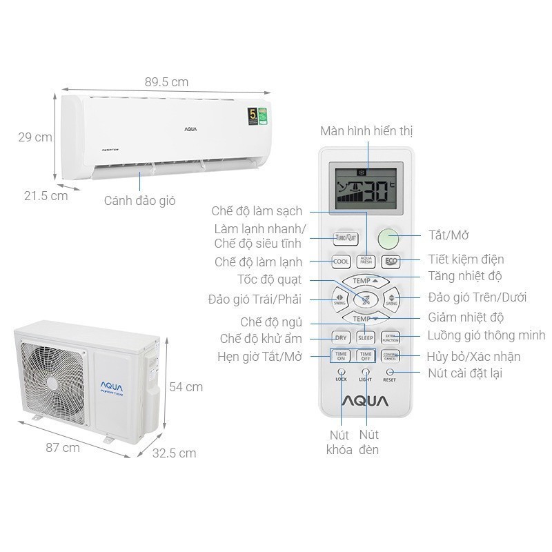 Thông tin cục nóng : Dài 80 cm – Cao 53,5 cm – Dày 27,5 cm – Nặng 30 kg