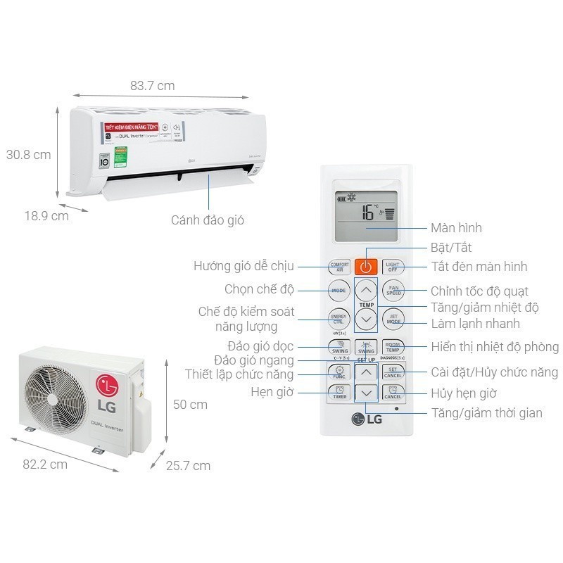 Dàn lạnh:Dài 83.7 cm – Cao 30.8 cm – Dày 18.9 cm – Nặng 8.2 kg
