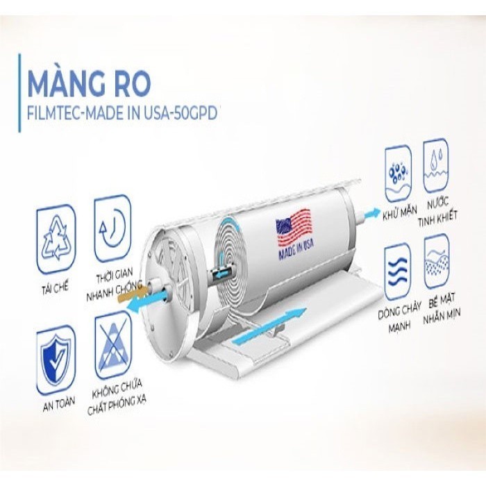 10 cấp lọc tiên tiến loại bỏ các chất bẩn độc hại và bổ sung khoáng chất. Màng lọc RO Filmtec Made in USA, Khử mùi Clo dư, mùi tanh trong nước, Loại bỏ các kim loại nặng, Asen, amoni, mangan, chì, thuốc trừ sâu độc hại, loại bỏ các vi khuẩn, virus gây bệnh… Tăng oxy hòa tan trong nước, chống lão hóa và ngăn ngừa khô da. Nước qua hệ thống lọc hoàn toàn tinh khiết và có thể uống ngay mà không cần đun sôi.