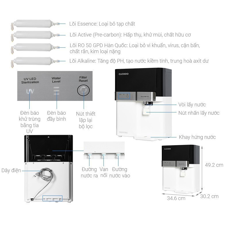 - Công nghệ lọc thẩm thấu ngược RO cho hiệu suất lọc nước tối ưu nhất, nguồn nước tinh khiết và tươi mới nhất. Bộ lọc khoáng kiềm (pH 9,5-10)