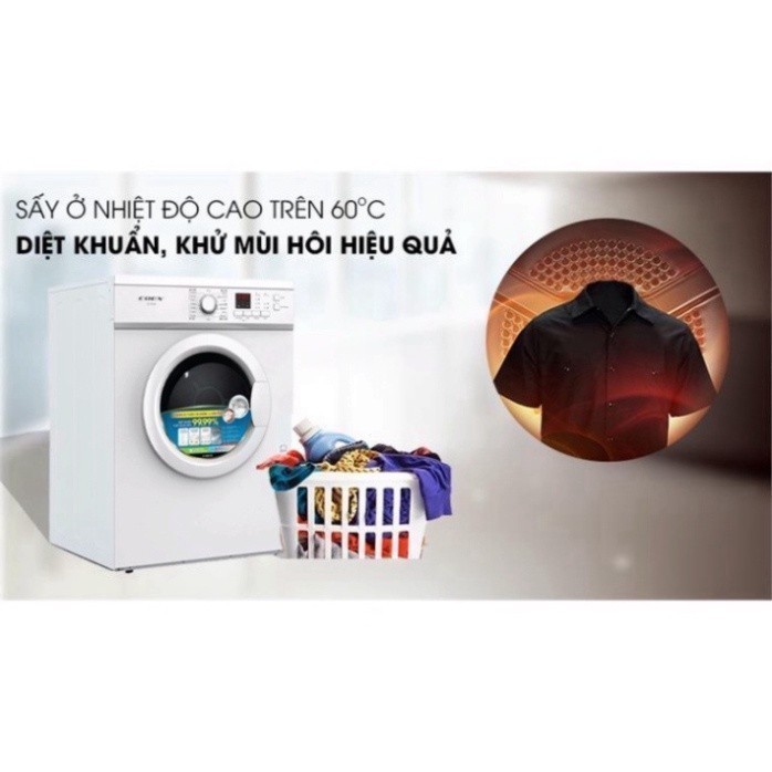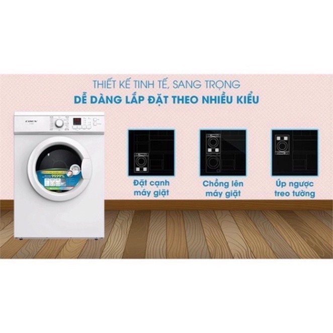 Thiết kế sang trọng và nhỏ gọn, dễ lắp đặt theo nhiều cáchMáy sấy thông hơi Coex 7.2 Kg CD-70AVW mang thiết kế tinh tế với màu trắng thanh lịch, có kích thước nhỏ gọn, trọng lượng vừa phải phù hợp với nhiều không gian nhà.Dù không gian giặt giũ nhà bạn rộng hay khiêm tốn, thì chiếc máy cũng dễ dàng được lắp đặt trong không gian với 3 cách lắp: đặt cạnh máy giặt, chồng ngược lên máy giặt, và úp ngược treo tường.Giảm nhăn quần áo hiệu quả nhờ công nghệ sấy đảo chiềuCông nghệ sấy đảo chiều hoạt động bằng cách xoay lồng sấy theo chiều kim đồng hồ và ngược lại, nhờ vậy nên quần áo sẽ được làm tơi ra, không bị xoắn gây nhăn và hư quần áo. Quần áo luôn sạch sẽ, thơm tho sau mỗi lần sấy nhờ khả năng diệt khuẩnÁo quần sẽ luôn khô thoáng, sạch sẽ, không bị ám mùi hôi nhờ được sấy ở nhiệt độ cao trên 60 độ C, với nhiệt độ này, các vi khuẩn, rận rệp sẽ bị loại bỏ với hiệu suất 99.hàng mới, mang đến cho người dùng những bộ đồ ưng ý nhất.Khối lượng sấy 7.2kg, phù hợp với gia đình 2 – 3 thành viênKhối lượng sấy tối đa lên đến 7.2kg, có thể đáp ứng tốt nhu cầu sử dụng của những gia đình có từ 2 – 3 người, đảm bảo quần áo luôn khô ráo khi rơi vào những ngày mưa gió kéo dài.Công nghệ sấy thông hơi giúp quần áo khô nhanh và tiết kiệm điệnMáy sấy thông hơi phù hợp với không gian rộng hoặc gần cửa sổ. Với công nghệ sấy thông hơi, máy sẽ giúp quần áo của bạn khô nhanh chóng và khả năng tiết kiệm năng lượng điện đáng kể. Sấy quần áo nhanh hơn với tính năng sấy nhanh 23pNgười dùng có thể chọn 4 mức nhiệt độ sấy khác nhau bao gồm:- Cao: Nhiệt độ sấy lên đến 80 độ C.- Trung bình: Nhiệt độ sấy lên đến 70 độ C.- Thấp: Nhiệt độ sấy đạt mức 45 độ C.- Thổi hơi: sấy không gia nhiệt bằng luồng khí mát khi quay lồng, phù hợp với đồ mỏng nhẹ, dễ bay màu.Nhìn chung, máy sấy thông hơi Coex 7.2 Kg CD-70AVW với cơ chế sấy thông hơi cho khả năng sấy quần áo nhanh chóng cùng với những ưu điểm vượt trội như: Công nghệ sấy đảo chiều giúp cho quần áo được sấy nhanh chóng, chống nhăn và tiết kiệm điện hiệu quả