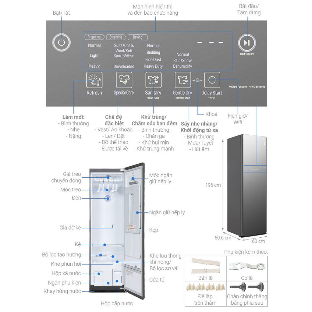 Bên trong tủ được thiết kế có các mốc treo có thể di chuyển linh hoạt. Cụ thể tủ có dung tích tối đa là 5 chiếc áo và 1 quần tây với kích thước vòng bụng lên đến 109cm. Với sức chứa này tủ hoàn toàn đáp ứng được nhu cầu chăm sóc quần áo đặc biệt cho cả gia đìnhCông nghệ hơi nước TrueSteam giúp giảm nhăn, diệt khuẩn và các chất dị ứng