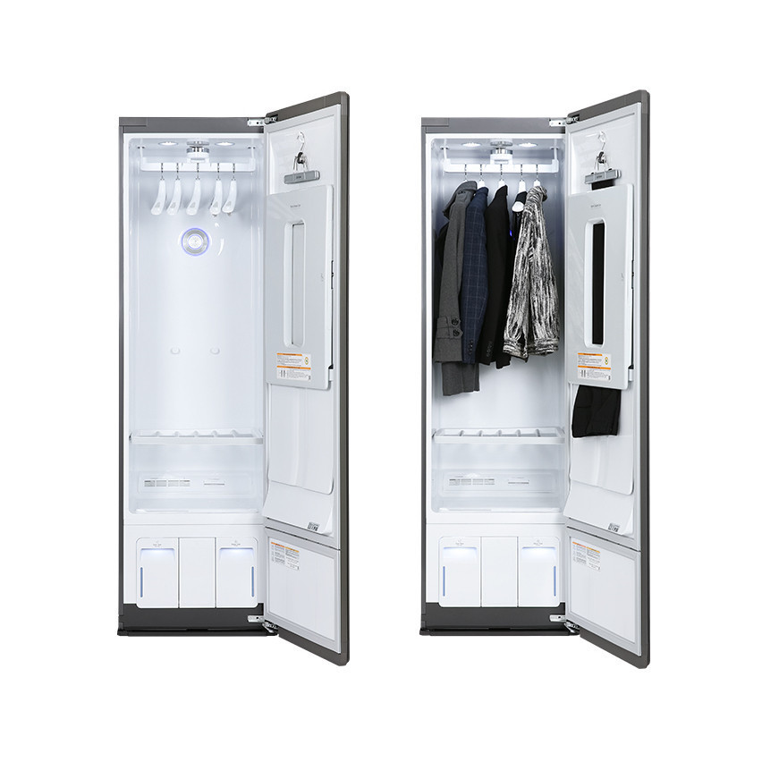 Phía trước tủ là bảng điều khiển cảm ứng cùng với màn hình hiển thị thời gian vừa giúp người dùng thuận tiện khi sử dụng vừa tạo nên sự hiện đại cho thiết bị. Các chức năng, chương trình giặt đều được chú thích bằng tiếng Anh cụ thể nên người dùng cũng thuận tiện hơn trong việc sử dụngBên trong lồng tủ được làm bằng thép không gỉ cực kỳ chắc chắn, có độ bền cao, tương tự như những chiếc máy giặt LG thực thụ. Hơn nữa thép không gỉ còn có khả năng kháng khuẩn, chống bám bẩn tốt nên việc vệ sinh tủ cũng dễ dàng hơnTủ Chăm Sóc Quần Áo Thông Minh LG Styler S5MB có sức chứa lớn