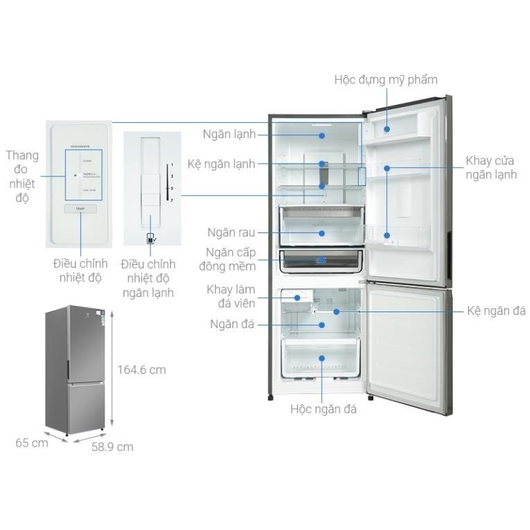 Thông tin lắp đặtKích thước tủ lạnh:Cao 164.6 cm – Rộng 58.9 cm – Sâu 65 cm – Nặng 52.5 kg
