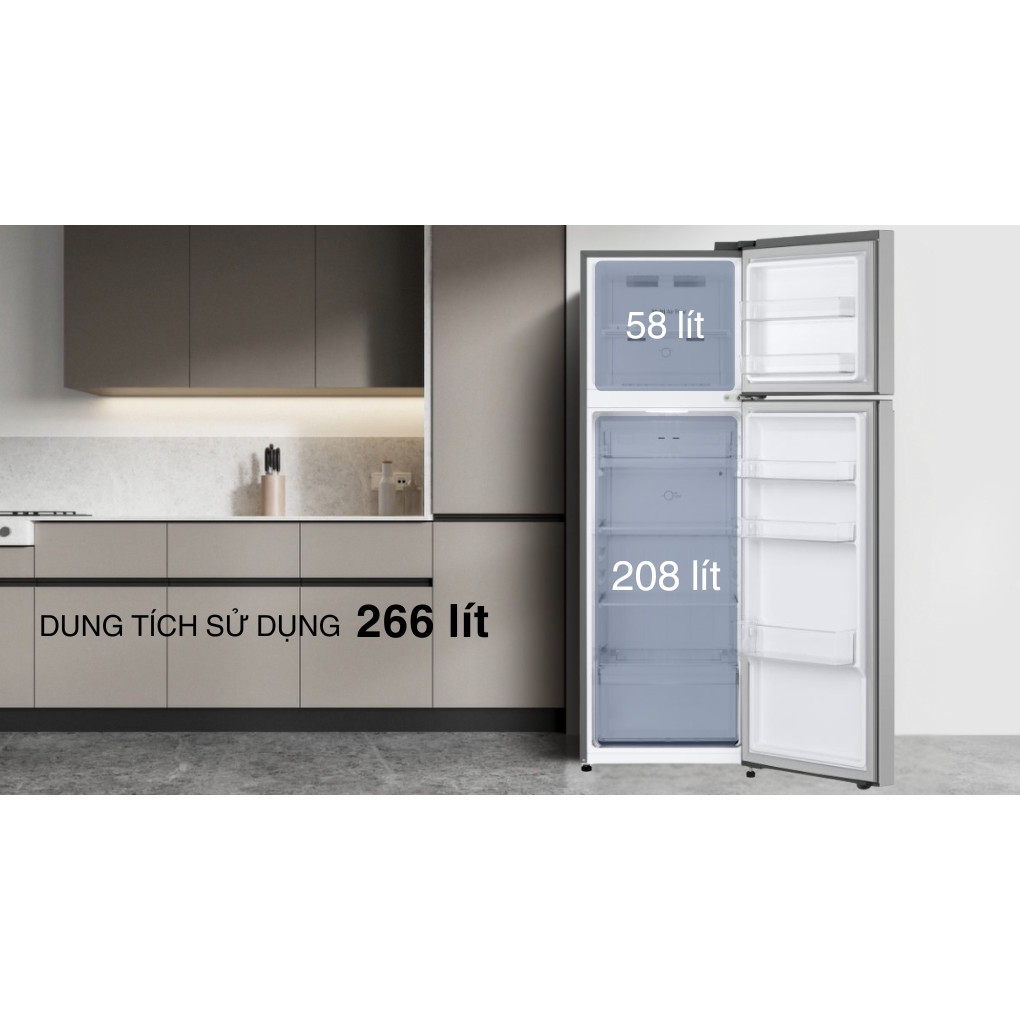 – Dung tích sử dụng 266 lít, trong đó ngăn lạnh 208 lít và ngăn đá 58 lít – phù hợp cho nhu cầu sử dụng hằng ngày của hộ gia đình nhỏ.