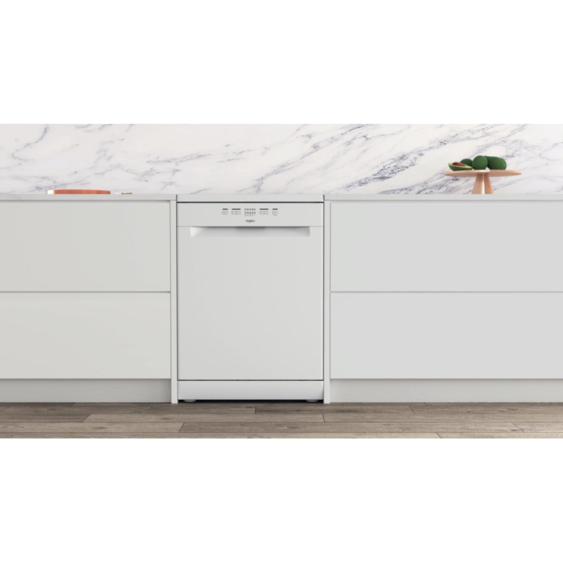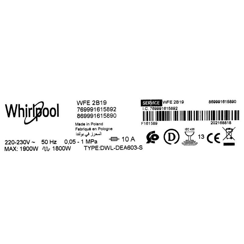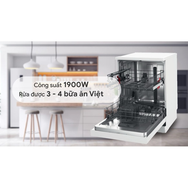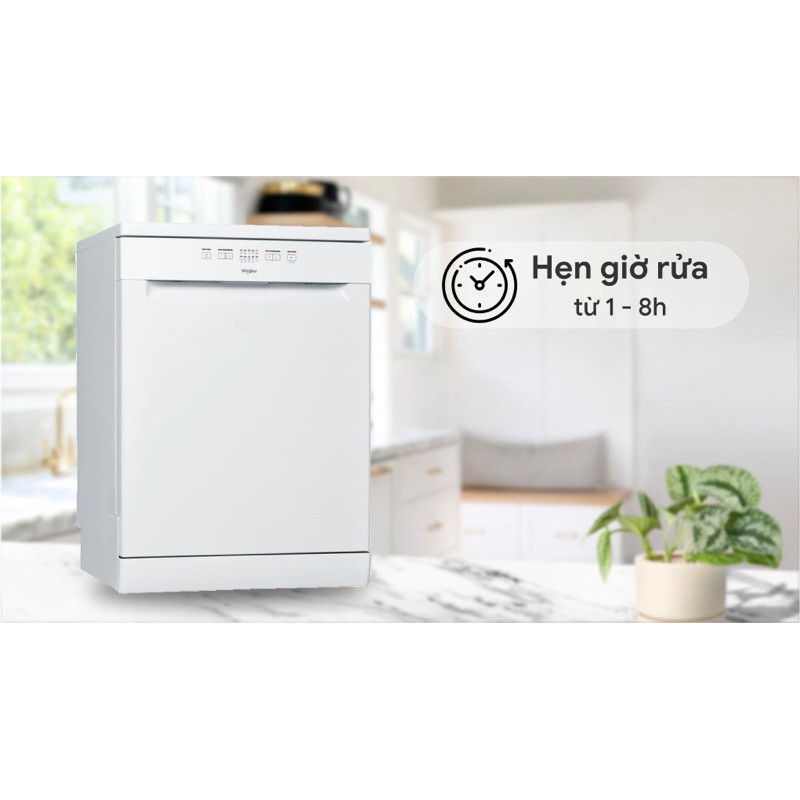 Máy rửa bát Whirlpool WFE 2B19 là mẫu thiết kế mới ra mắt của Whirlpool với dáng thiết kế độc lập, gọn đẹp. 5 chương trình tiện lợi đi kèm công nghệ rửa nước nóng diệt khuẩn, loại bỏ mảng bám, vết dầu mỡ hiệu quả.Tổng quan thiết kế – Sản phẩm thuộc loại máy rửa bát độc lập, dễ dàng lắp đặt ở bất kỳ vị trí mong muốn nào trong nhà, gam màu trắng thanh lịch kết hợp hài hòa với nhiều không gian nhà ở khác nhau. – Máy được chế tạo từ chất liệu thép không gỉ bền đẹp, giảm tình trạng rò rỉ trong quá trình sử dụng, đồng thời giúp kéo dài tuổi thọ cho thiết bị. Khay rửa và giá đỡMáy rửa bát này có 2 khay để chén gồm khay để chén trên và khay để chén dưới.- Với khay để chén trên thiết kế có thể thay đổi độ cao nhằm tăng thêm không gian cho các sản phẩm cồng kềnh bên dưới. Để thay độ cao cần nắm giữ hai bên của khay chén và nâng lên, cố định vào chốt hai bên, khi muốn hạ xuống gạt cần gạt hai bên xuống. Ngoài ra, còn có một cánh lệch có thể gập lại nhằm tối ưu hóa không gian sắp xếp hoặc mở ra tạo thành giá đỡ để các vật dụng nhỏ như chén nước chấm, tách trà,…- Khay để chén dưới còn được thiết kế thêm giỏ đựng dao kéo nhằm để các vật nhỏ như thìa, nĩa, muỗng, dao, kéo,… tránh bị rơi ra ngoài trong quá trình rửa.Công suất hoạt động- Công suất hoạt động tối đa 1900W, máy rửa bát cho độ ồn khoảng 49 dB. – Lượng nước tiêu hao cho 1 chu kỳ rửa là 12 lít/lần với khả năng chứa từ 3 – 4 bữa ăn.- Đạt chuẩn tiết kiệm năng lượng A+ giúp tiết kiệm lượng điện năng tiêu thụ so với các dòng máy rửa bát thông thường khác.