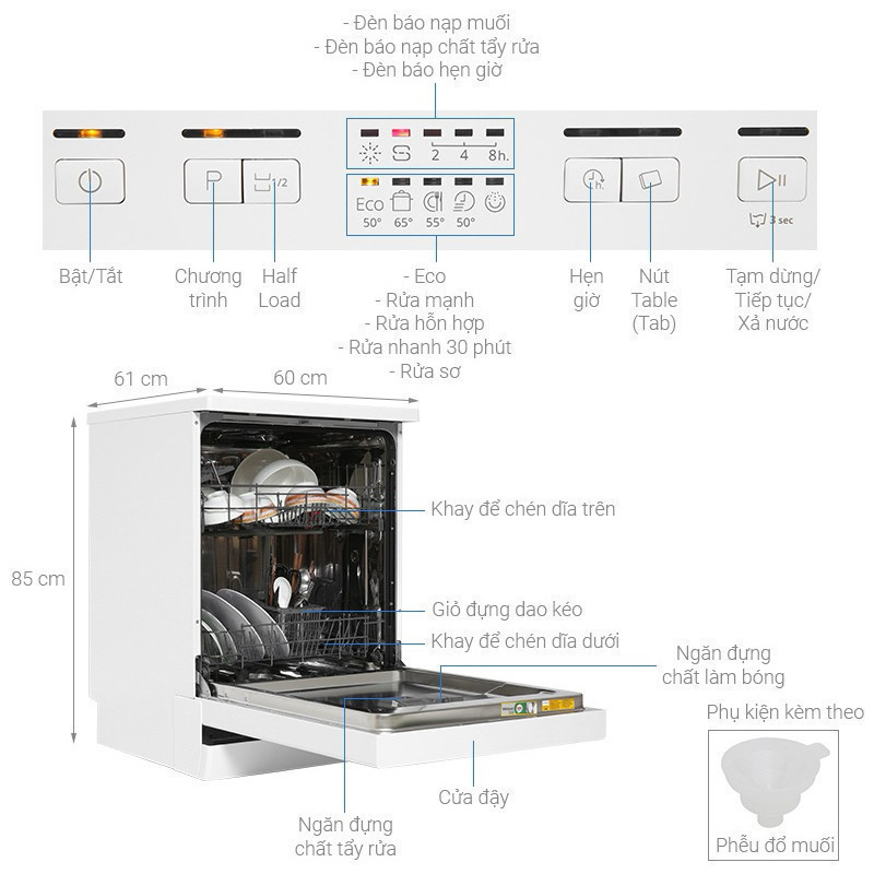– Đèn báo hết muối và nước làm bóng: giúp bạn biết được lượng muối còn lại trong máy trước khi bắt đầu chu trình rửa, nhằm đảm bảo hiệu quả rửa tốt và máy hoạt động lâu bền hơn.